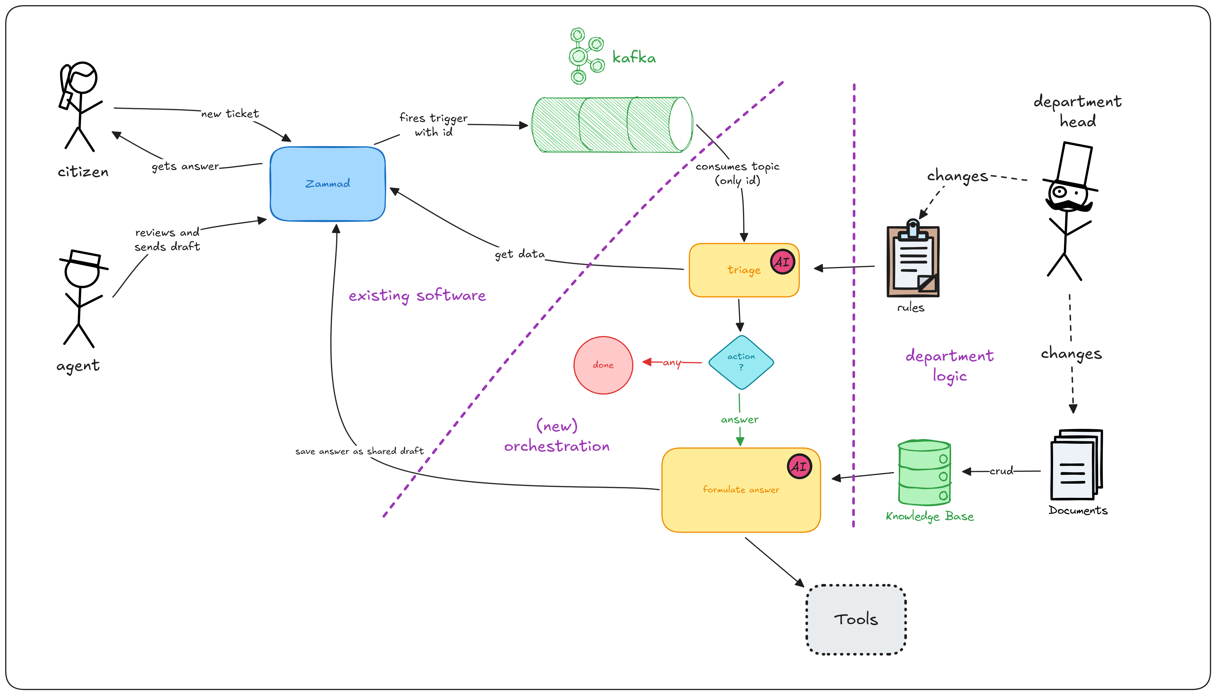 The service shall be notified via a Kafka topic about new tickets and ticket updates. It shall then gather ticket information via the API. The ticket shall first be triaged to determine if AI assistance is needed. If so, the service shall generate a response using a GenAI model and enhance it with relevant context from a knowledge base or external tools. Finally, the generated response shall be sent back to Zammad via the API as a draft.