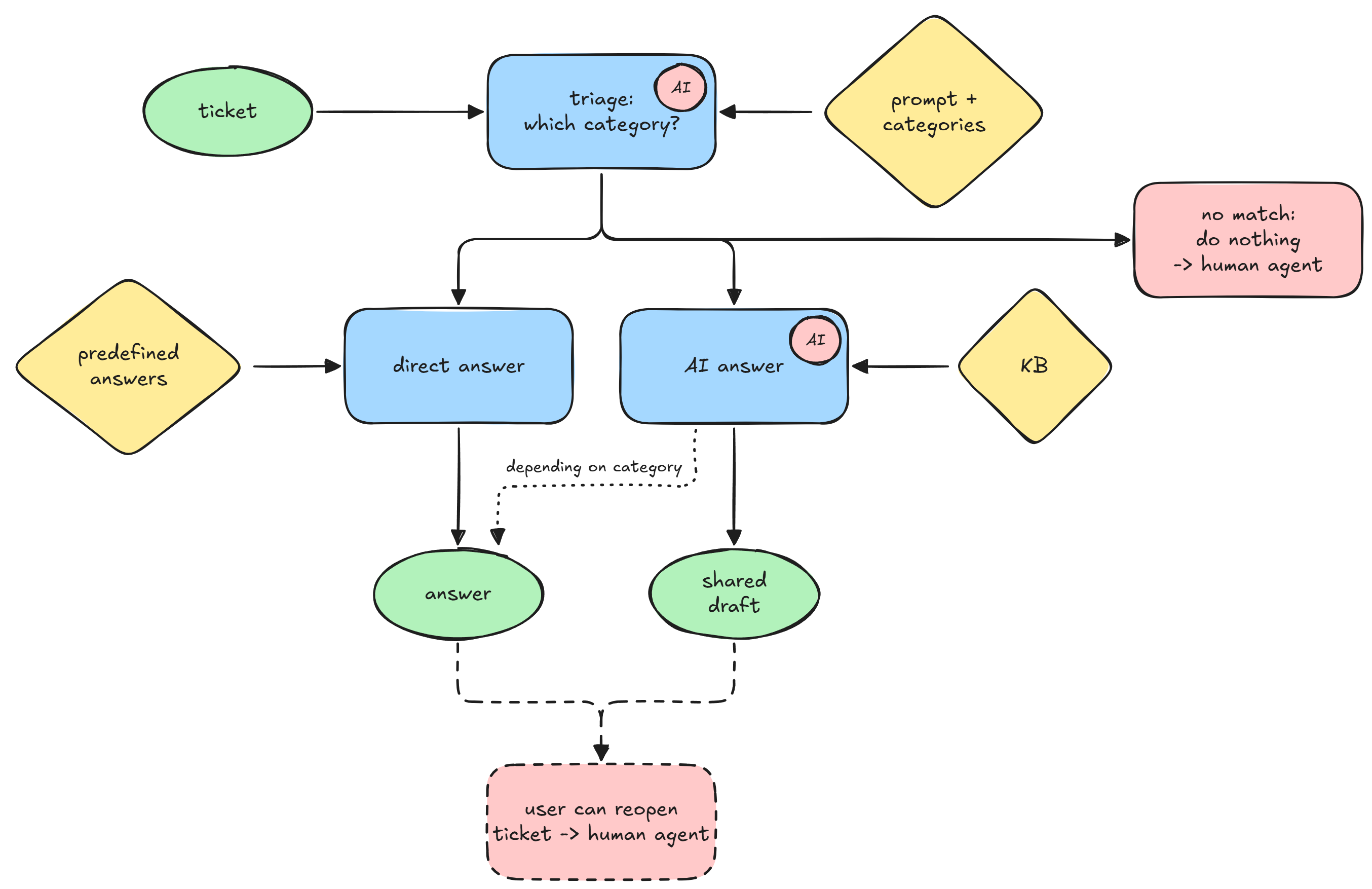 - 2a: Fully Automated Processing: For tickets that fall into categories deemed safe for automation (e.g., common inquiries, FAQs), we respond with a predefined answer directly to the customer. The ticket will be auto-closed after a specified period (e.g. 14 days) if there is no customer response.