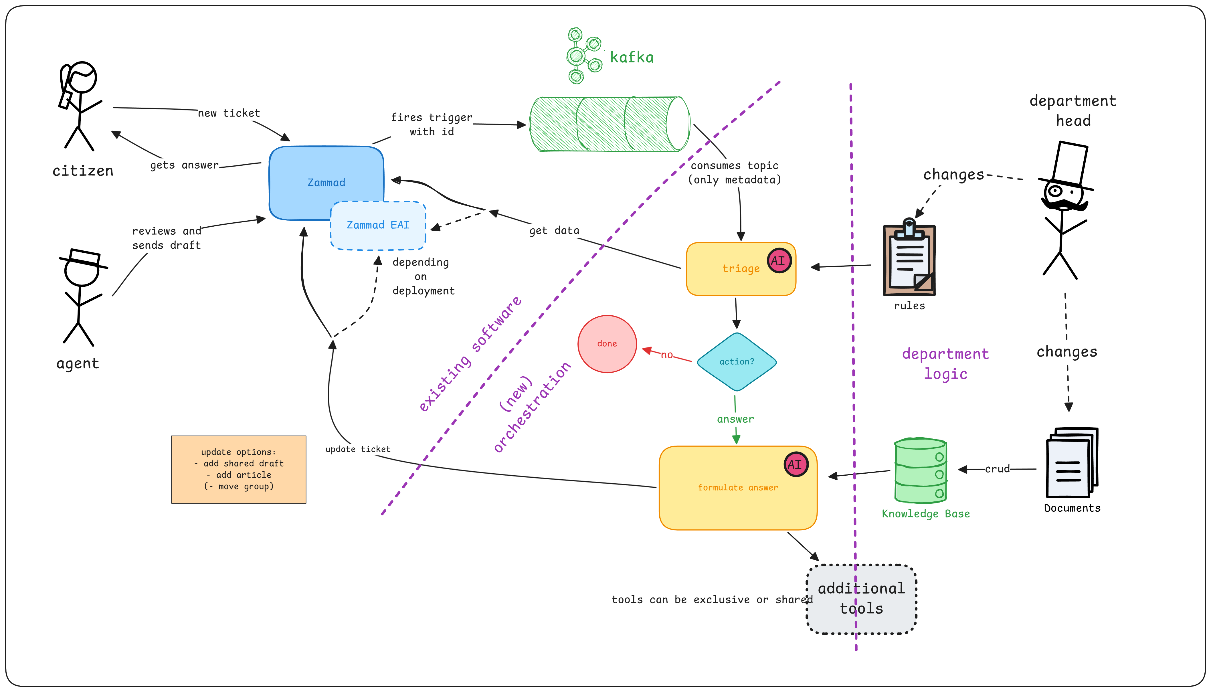 The service shall be notified via a Kafka topic about new tickets and ticket updates. It shall then gather ticket information via the API. The ticket shall first be triaged to determine if AI assistance is needed. If so, the service shall generate a response using a GenAI model and enhance it with relevant context from a knowledge base or external tools. Finally, the generated response shall be sent back to Zammad via the API as a draft.